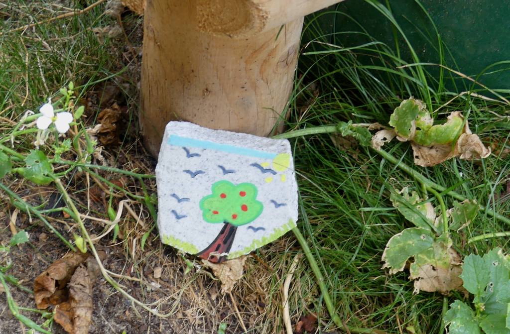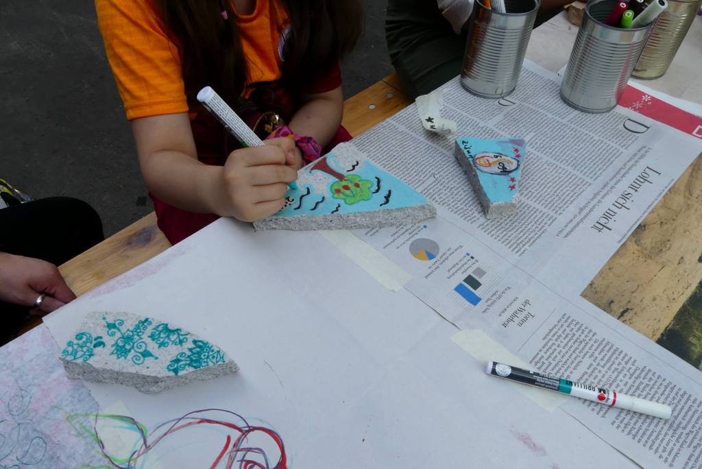Neben Rollern, Farradfahren und dem Ausprobieren von anderen Bewegungelementen auf der schönen langen Straße wurde wieder gerne und viel gemalt, unter anderem wurde Steine zur Verschönerung der Baumscheiben bemalt, die auch an diesem Tag wieder gewässert und gepflegt werden.