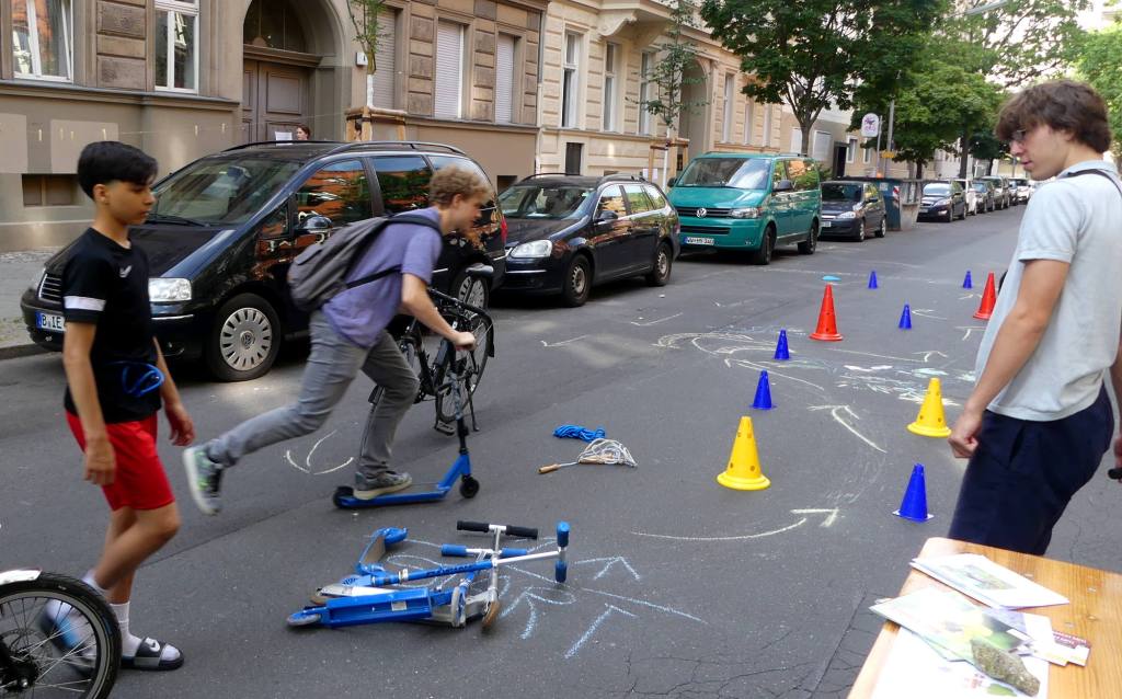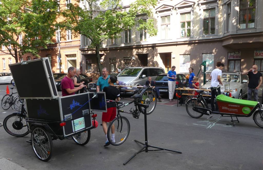 Am 30.6. war es wieder so weit: Einen ganzen Nachmittag konnten wir gemeinsam mit Akteurinnen und Anwohnerinnen demonstrieren, welch eine Begnungzone die Straße sein kann, wenn der Automobilverkehr eingeschränkt ist. Seit 2018 engagiert sich die Intiative Steinmetzkiez http://steinmetzkiez.org/ für eine Verkehrsberuhigung ihrer Straße, mit unterschiedlichen Aktionstagen in diesem Jahr soll bei weiteren Anwohner*innen und (Bezirks-) Politiker*innen dafür geworben werden, sich diesem Vorhaben anzuschließen, damit eine Straße der Begegnung in nicht allzu ferner Zukunft Realität werden kann.