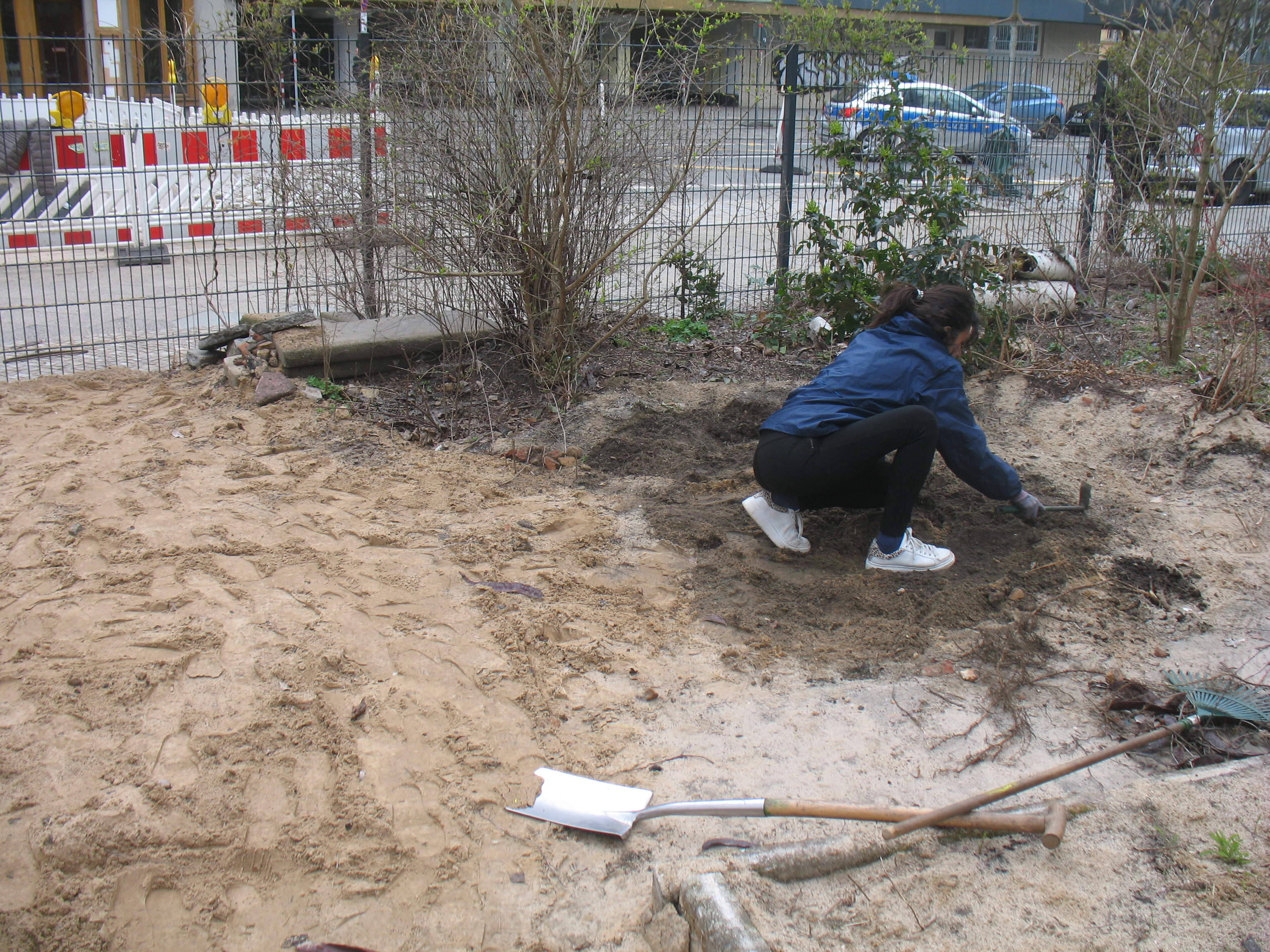 Zudem haben wir begonnen, einen Sandplatz für Wildbienen (und wer weiß, wer sich noch dort wohlfühlen wird) mit Totholz, Steinen und einer Vogel-/ Insektentränke zu gestalten.