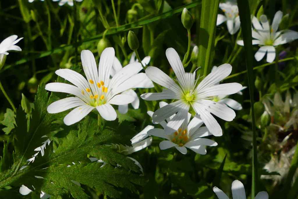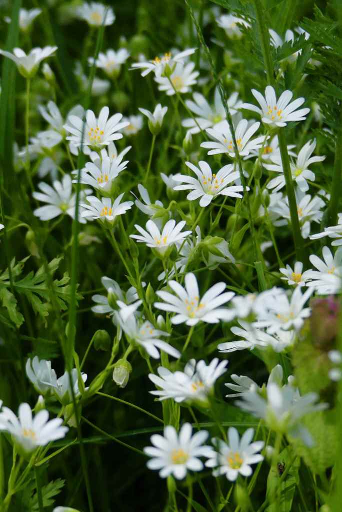Eigentlich an Gehölzrändern beheimatet, breitet sich die Große Sternmiere bei uns wunderbar in unserem naturah gestalteten Staudenbeet aus und steht dort recht sonnig, aber zur heißen Jahreszeit auch gut von hoch wachsenden Stauden beschützt.