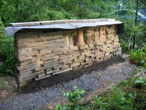 Diese Wand liegt am Rande unseres Gartenbereiches mit einer offenen Kiesdecke, der ebenfalls unter dem Aspekt gestaltet wurde, dass Insekten dort einen Lebensraum finden. Es handelt sich dabei um eine offene Kiesdecke, die mit einem Unterboden unterlegt ist und die von nektartragenden Blühpflanzen besiedelt wird.