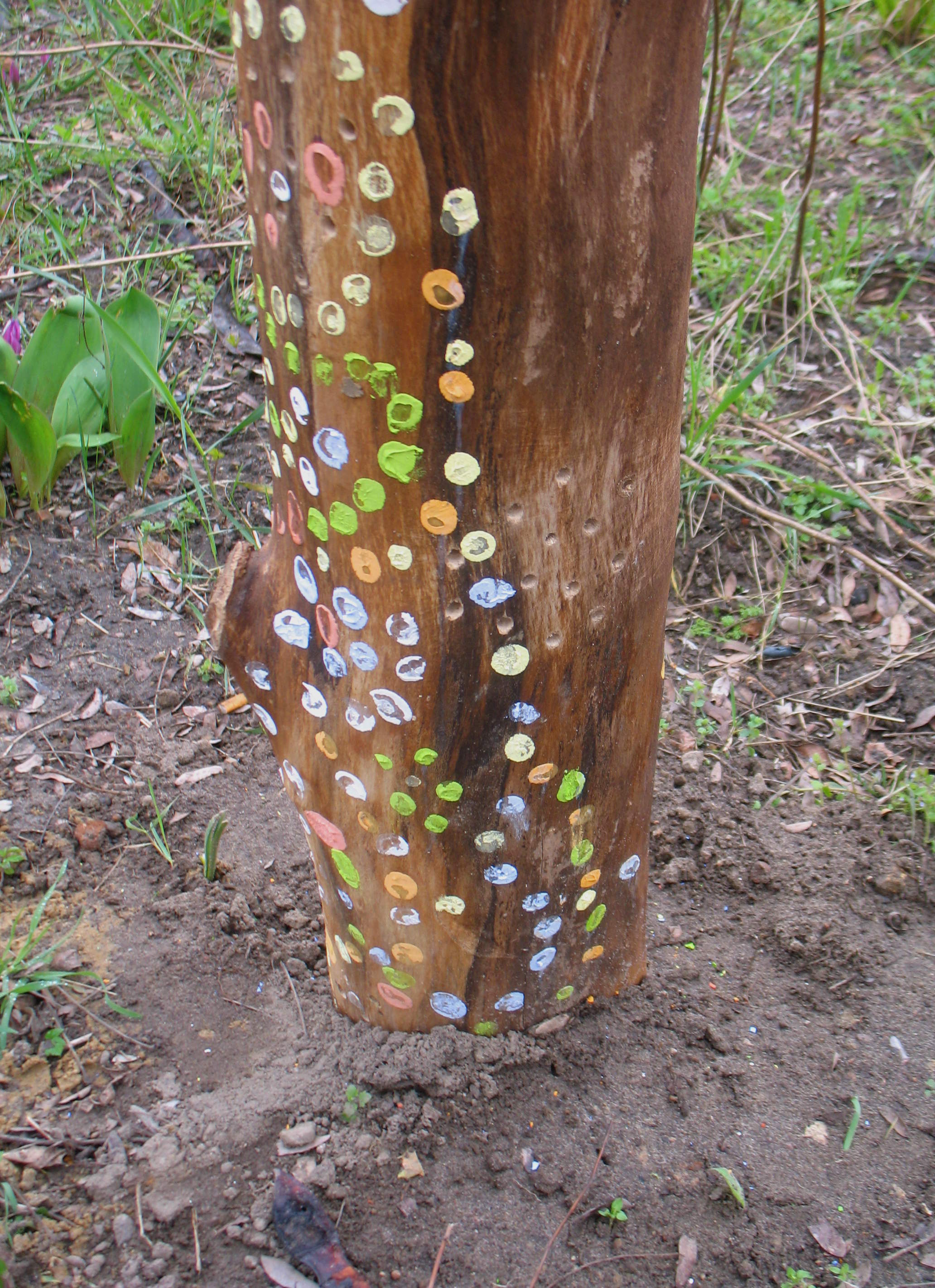 Die dafür verwendeten Baumstämme wurden mit entsprechenden Bohrungen versehen, in denen die Bienen ihre Nistplätze einrichten können.