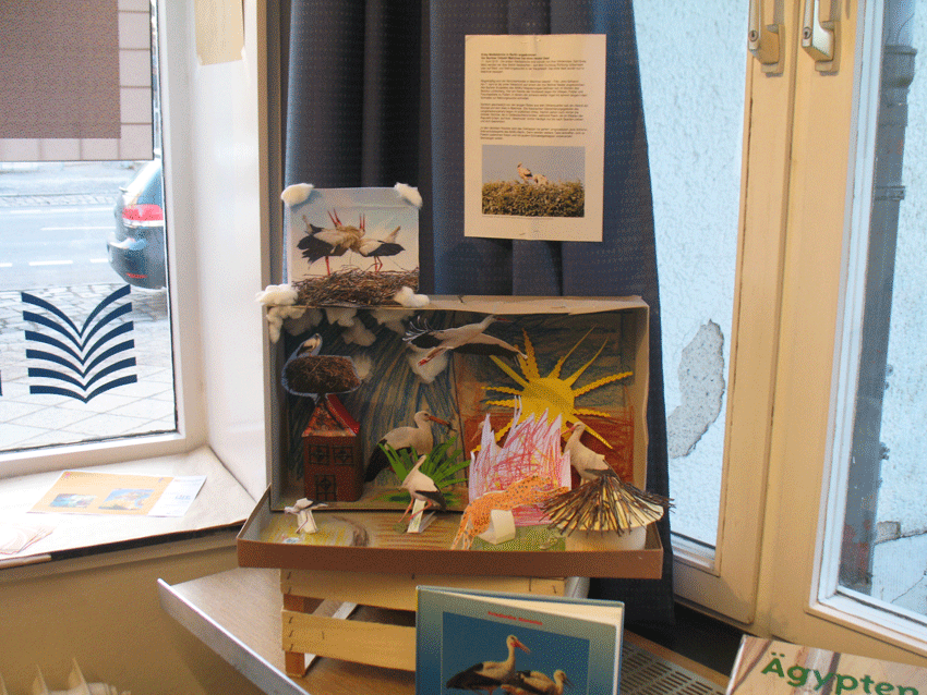 In den Werkstätten der Grünen Bibliothek sind in diesem Winter individuelle Bücher, Hefte, Stempel und Selbstgenähtes in Gemeinschaftsarbeit entstanden, aber nun steigt mehr und mehr die Sehnsucht nach wärmeren Jahreszeiten, dem Duft von Erde und dem Aufenthalt im Garten in uns auf und das Diorama von den Störchen gibt dieser Sehnsucht zusätzliche Nahrung.