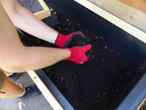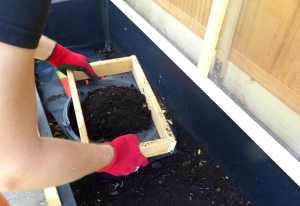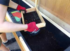 Wir haben den fertigen Wurmhumus noch einmal durchgesiebt, um eine feinkrümelige Substanz zu erhalten und die übrig gebliebenen größeren Stücke wieder zurück zu den Würmern geworfen, da können sie sich ja noch mal mit beschäftigen.